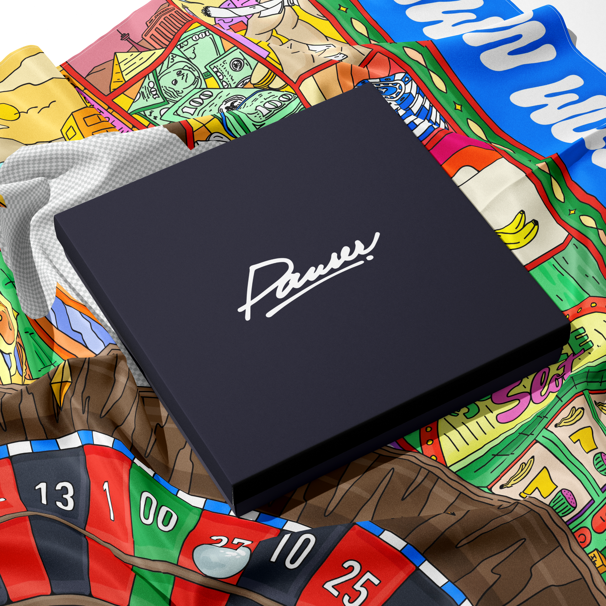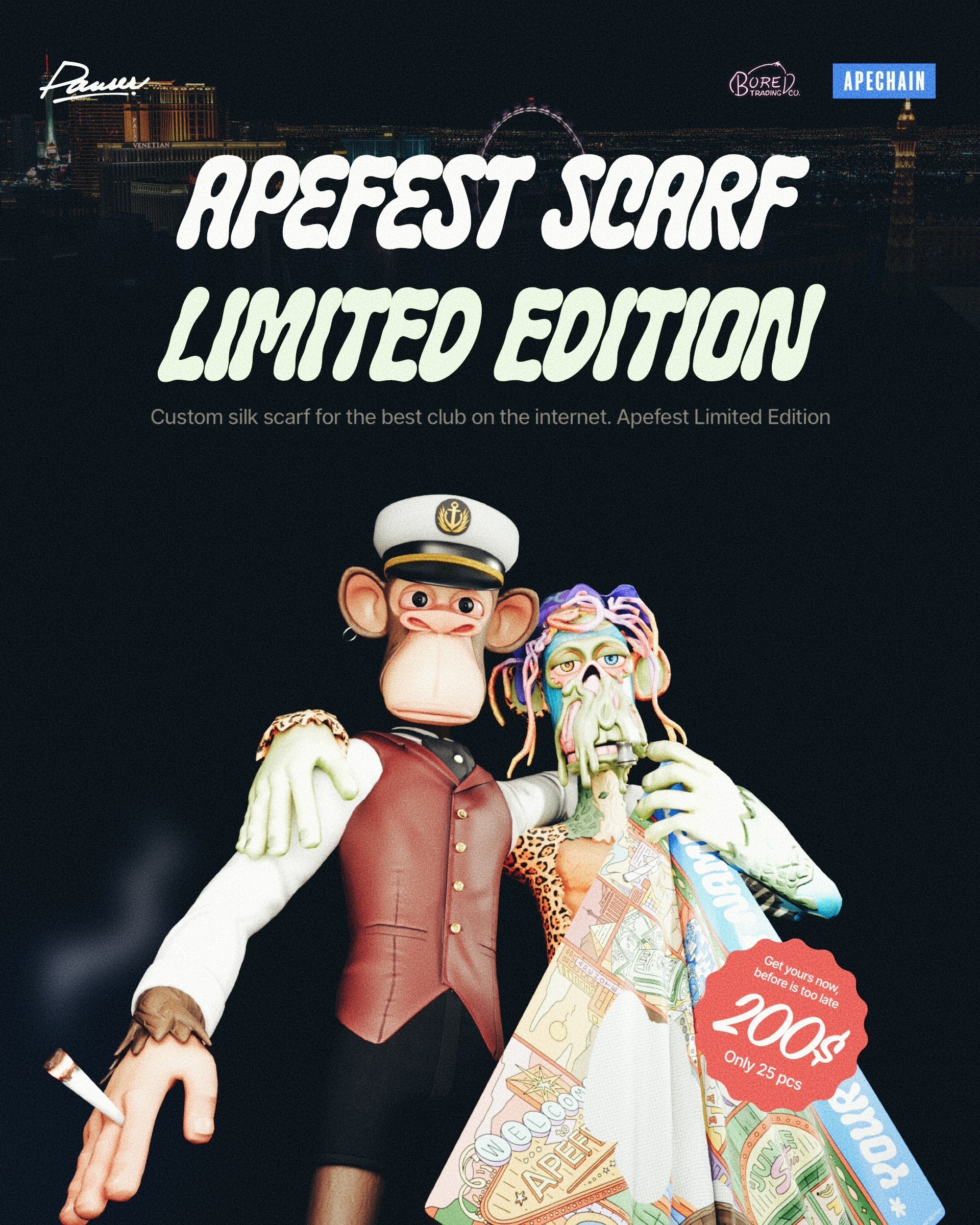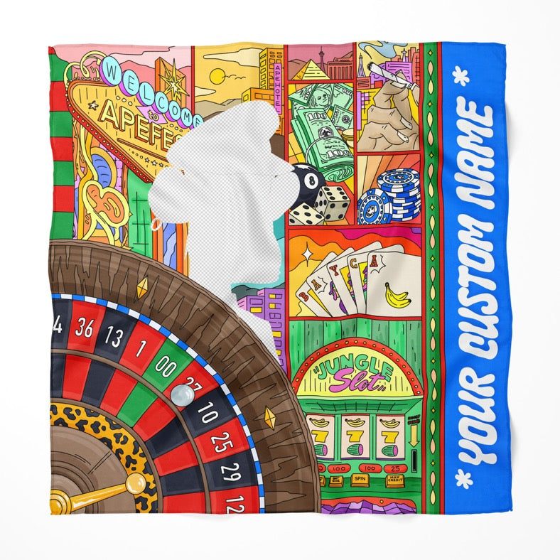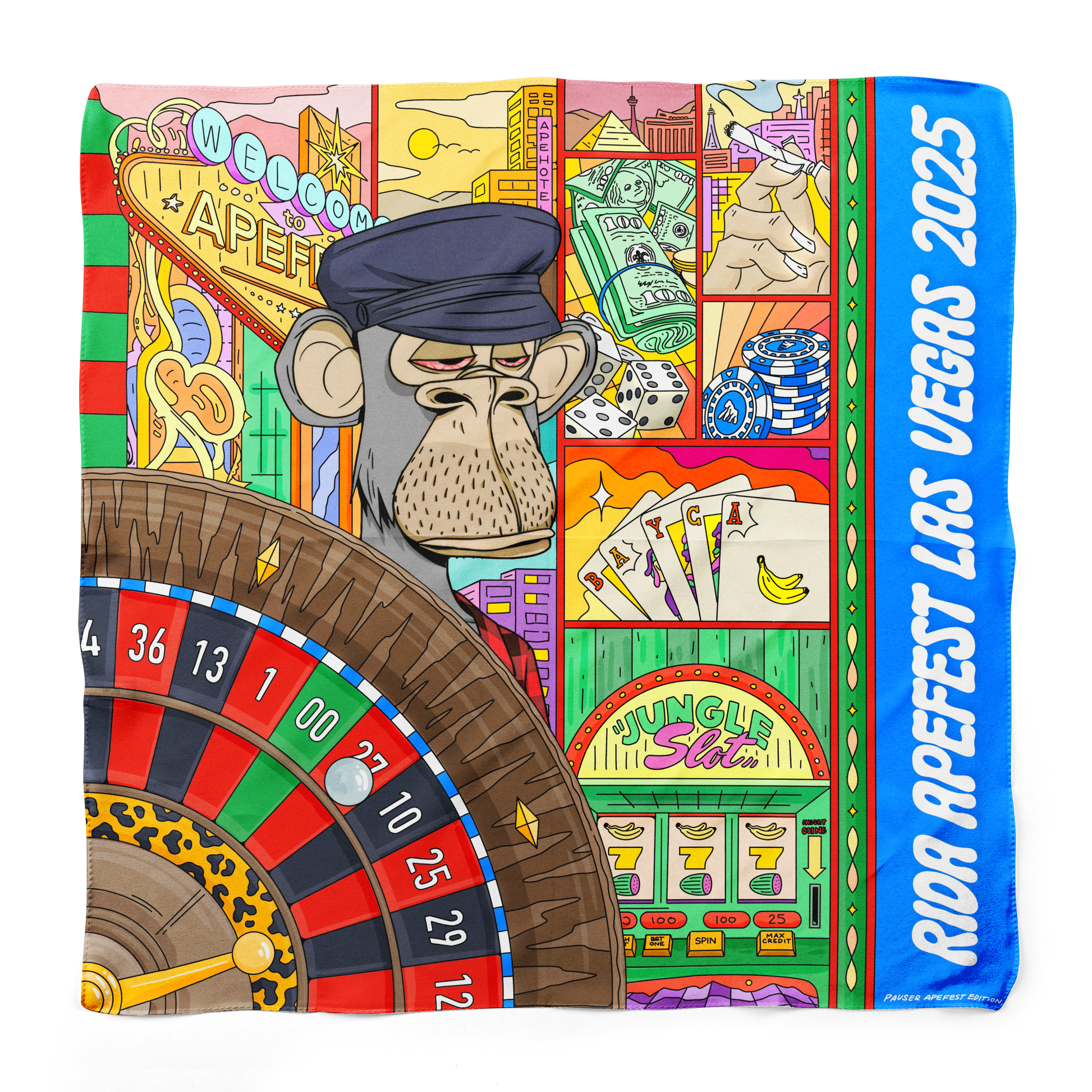 Vegas Roulette – Custom Silk Scarf by Pauser Celebrate the glitz of Las Vegas and ApeFest 2025 with this luxury silk scarf by Pauser. Crafted from 100% silk twill and hand-finished, it features vibrant roulette wheels, signs, and slot machine motifs in Pauser’s bold style—blending high fashion with Web3 culture. Each 90 × 90 cm scarf is a 1/1 collector’s edition, customized with your BAYC/MAYC NFT and chosen name, making it a unique wearable art piece. Exclusive to ApeFest Las Vegas 2025, it’s a perfect fusion of luxury craftsmanship and NFT individuality.