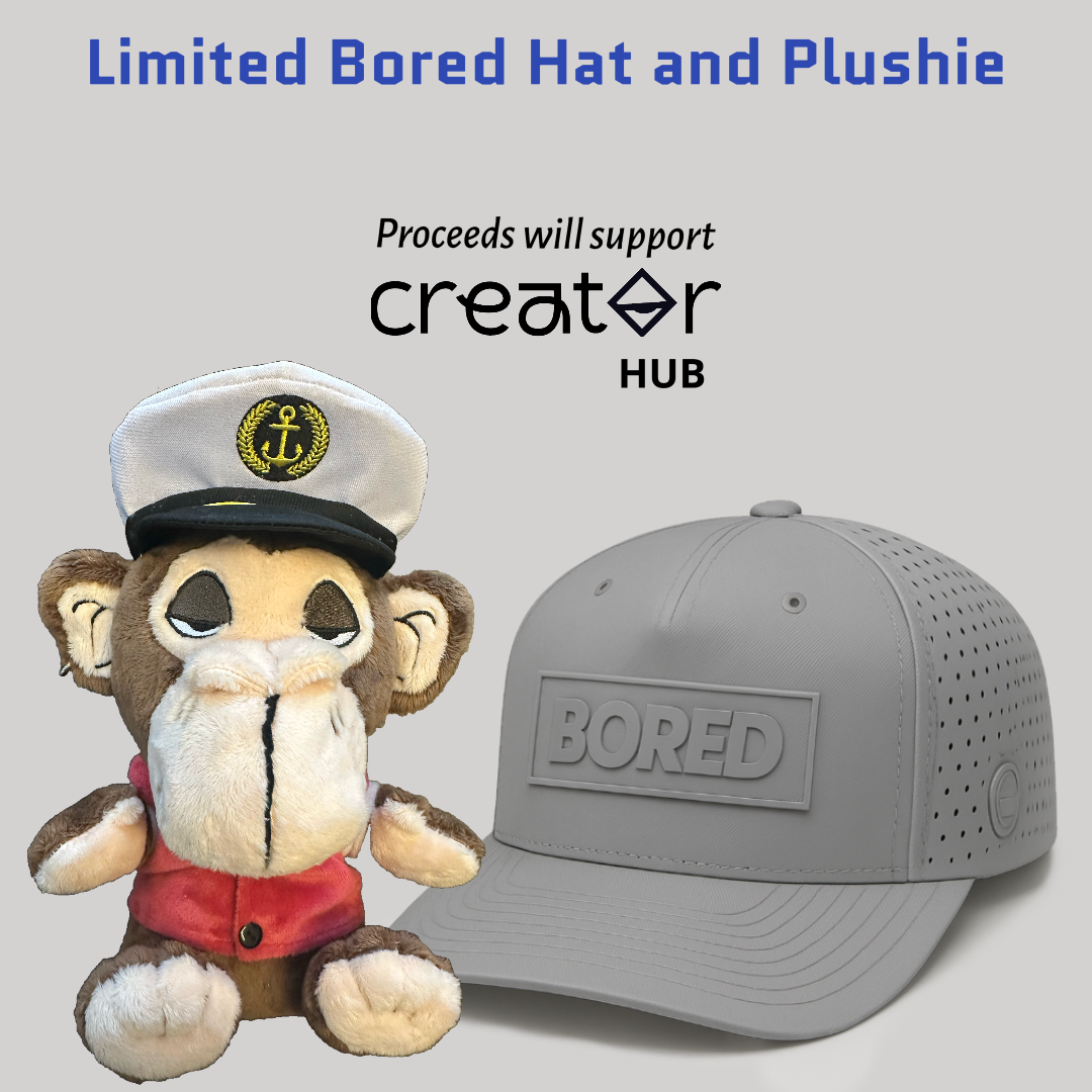 Trucker / golfer hat waterproof hat with rubber PVC “BORED” and Creator logo. The BAYC 8500 plushie is collectible made in collaboration with ClubMars. The limited bundle is created to support the Creator HUB at Ape Hotel for ApeFest Las Vegas. The proceeds will go to supporting community events and MBAs. This is a presale which will ship in October and made available for picked up at the Creator HUB at 3rd floor Ape Hotel (Conrad Resorts World) on Thursday-Saturday.